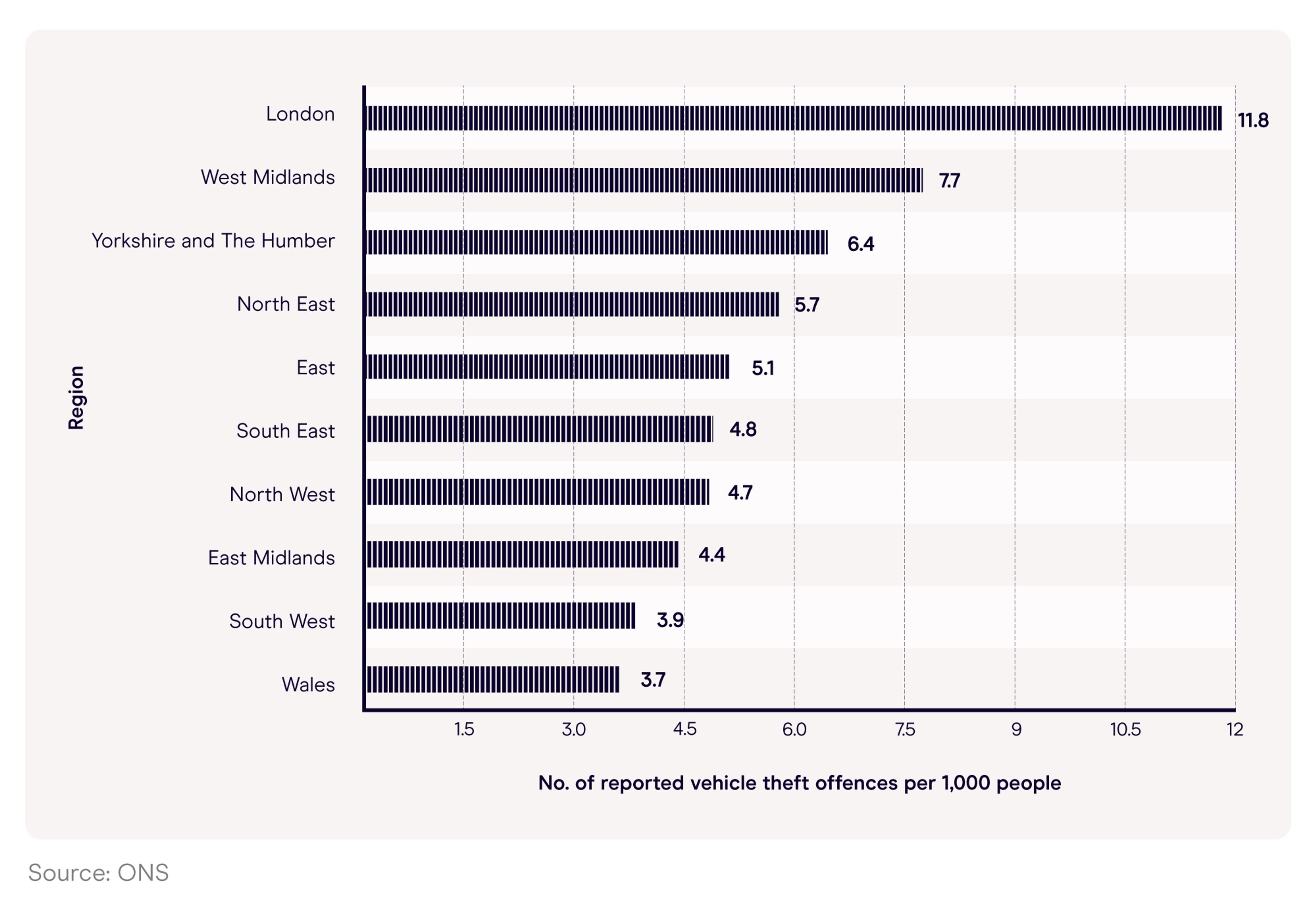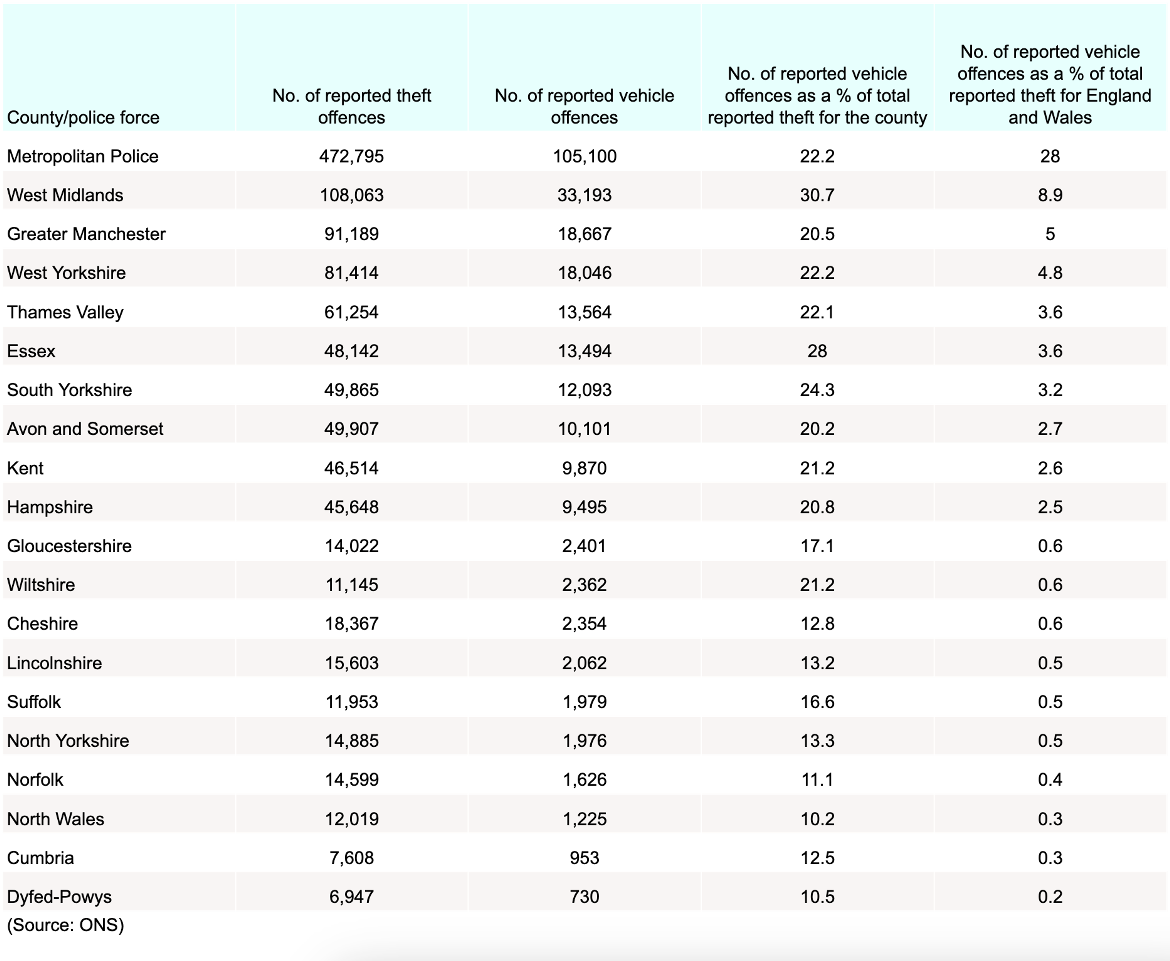 When broken down by country, England’s population of approximately 57.7 million generates a vehicle theft rate of 6.3 incidents per 1,000 residents compared to 3.7 vehicle thefts per 1,000 people in Wales.
