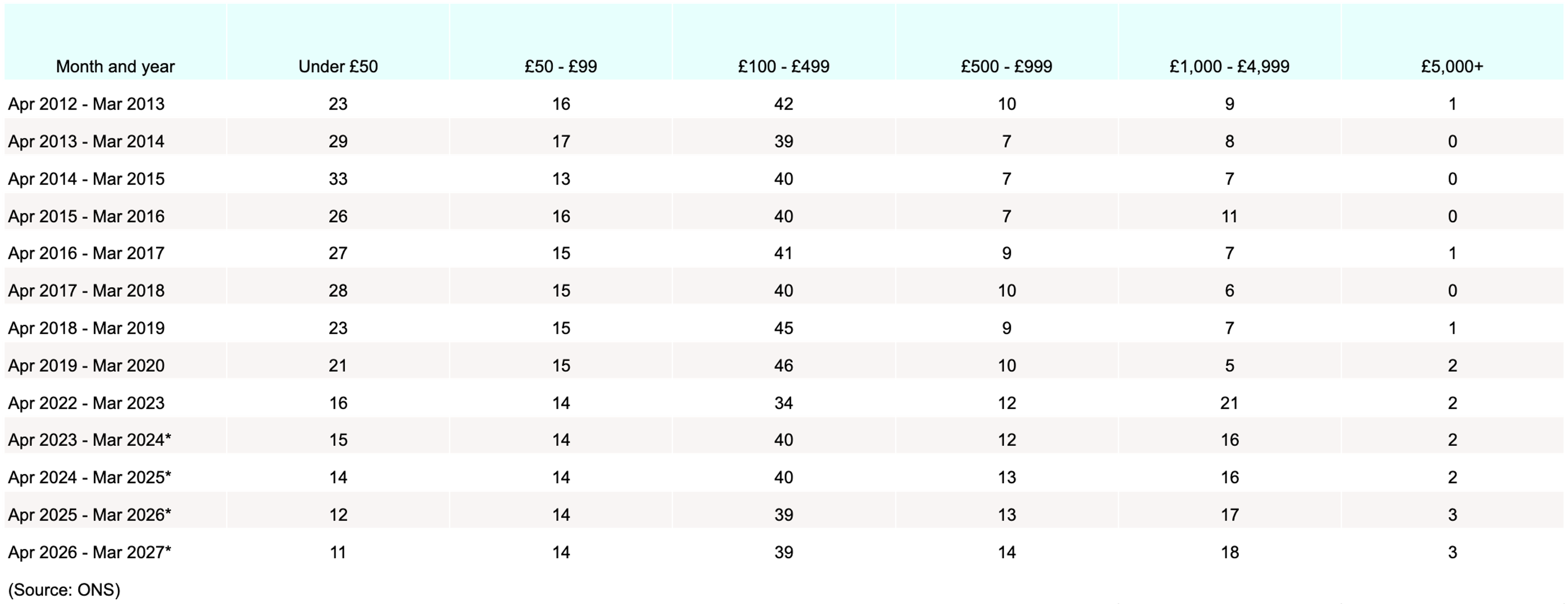 An estimated two-fifths (40%) of damage caused by vehicle theft in 2024-25 was between £100 and £149.08