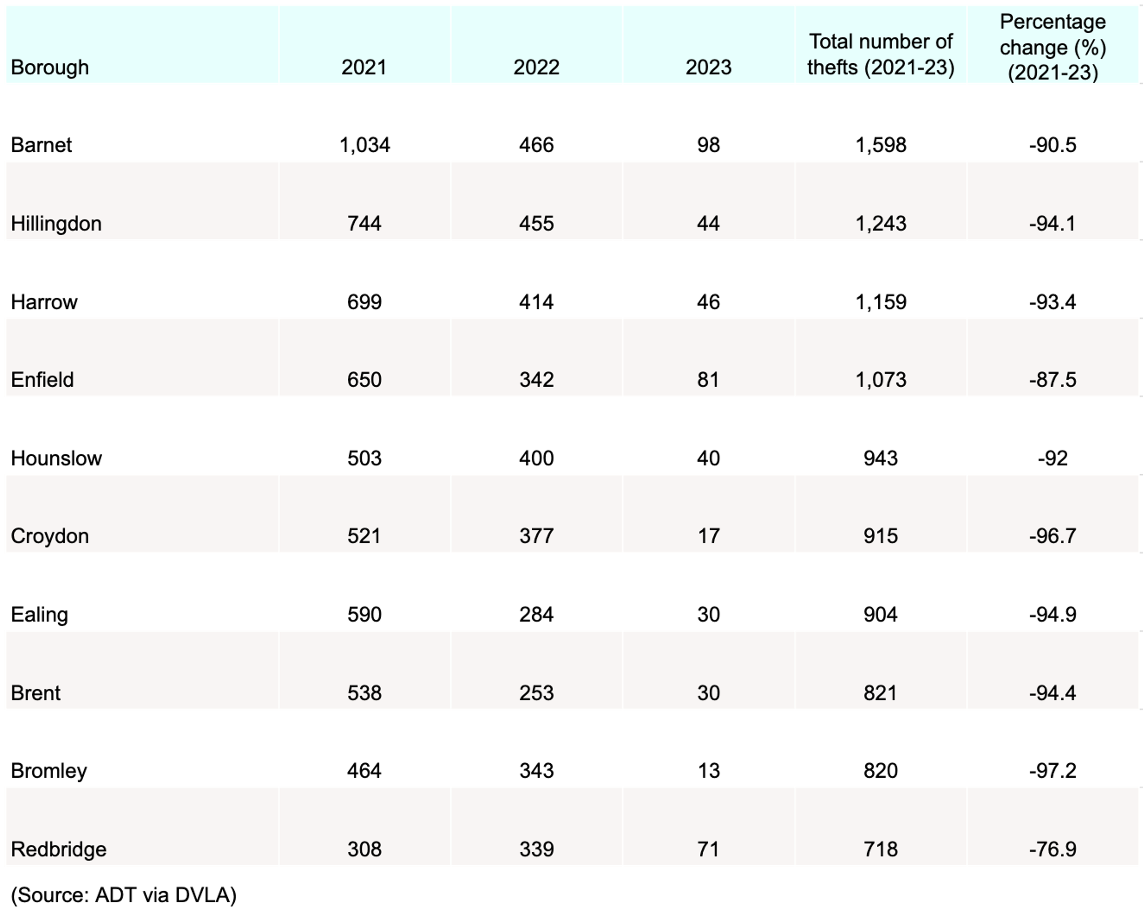 Of the top 10 London boroughs for reported catalytic converter theft, Bromley witnessed the largest percentage drop between 2021-23 (-97.2%) to just 13 recorded cases in 2023 – the lowest figure across all 10 areas of the capital in the ADT study.