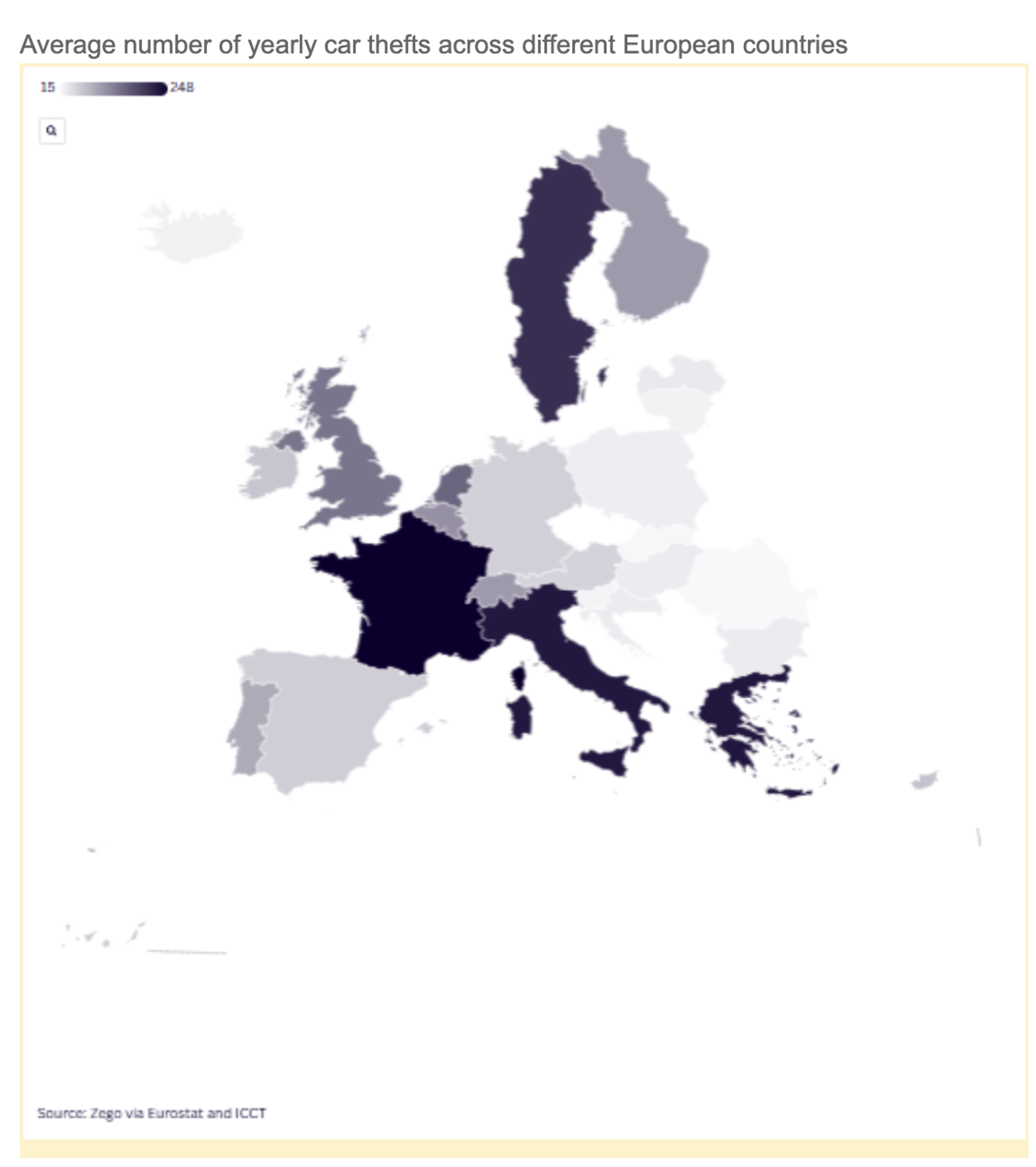 France has the highest rate of vehicle theft in Europe, with 248 per 100,000 people, compared to the UK in seventh with 142 per 100,000 residents.06