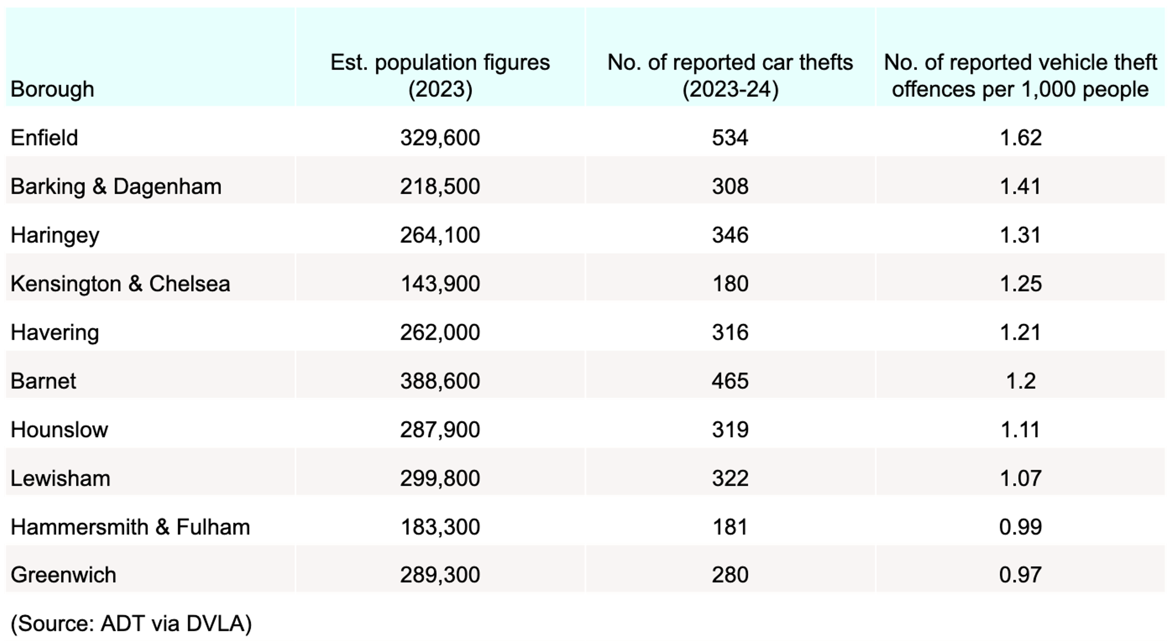 In the year ending September 2024, there were 375,048 reported vehicle thefts across England and Wales, equating to roughly 6.2 thefts per 1,000 people.02