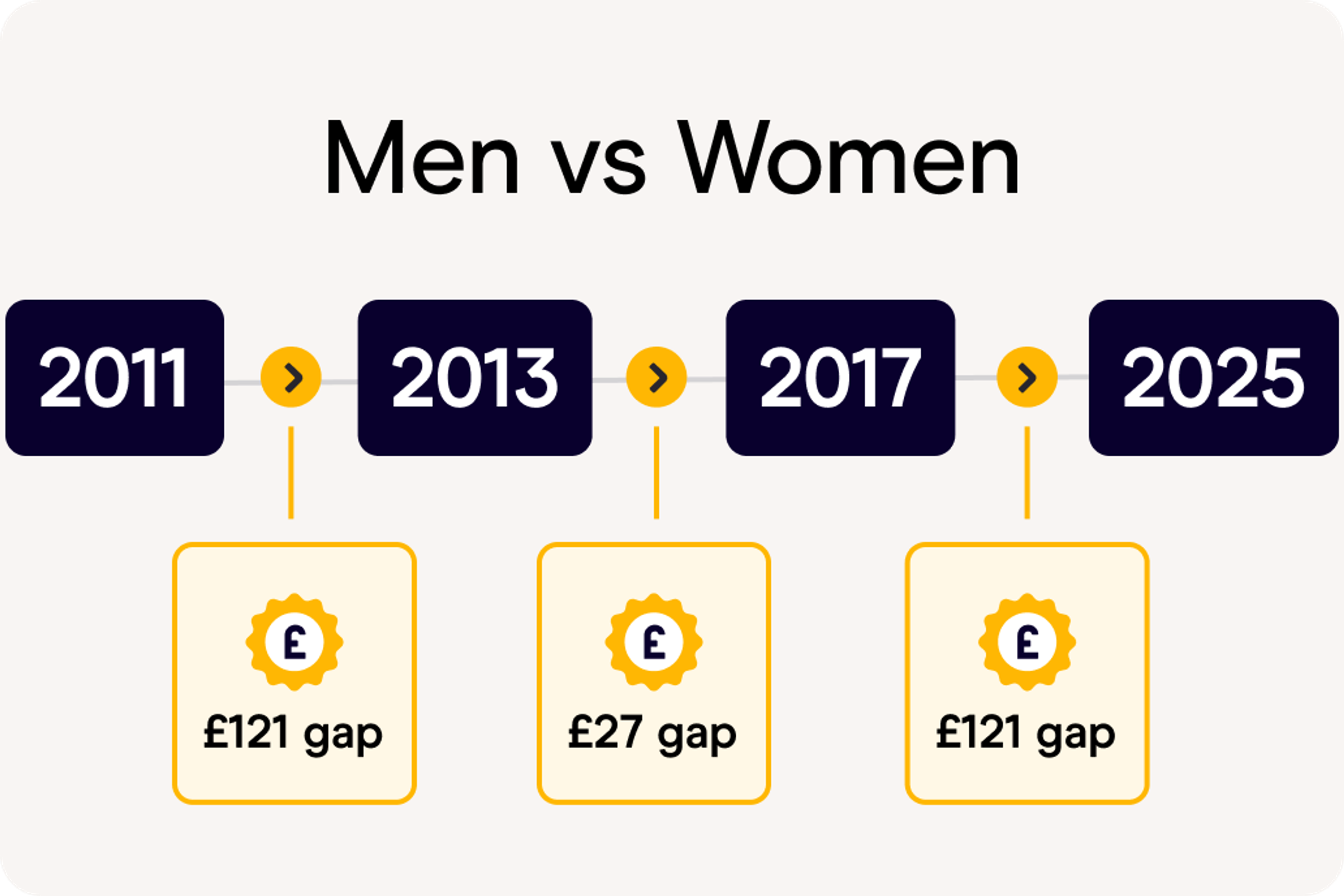 The gender gap has shifted over time. Before the EU directive, the gap was £121 in December 2011. It dropped to just £27 in 2013, but by 2017 it had widened back up to £121 [11].
